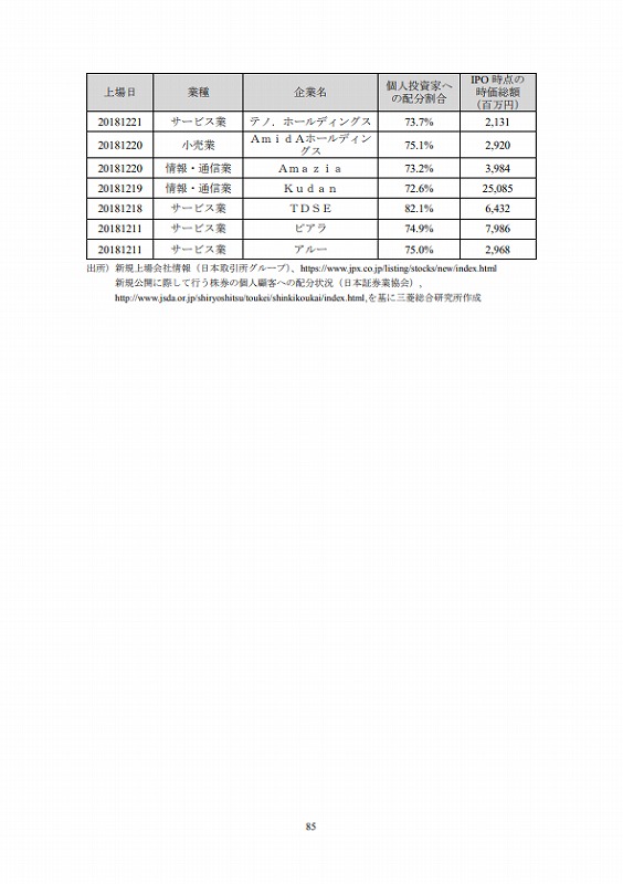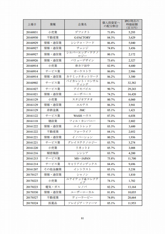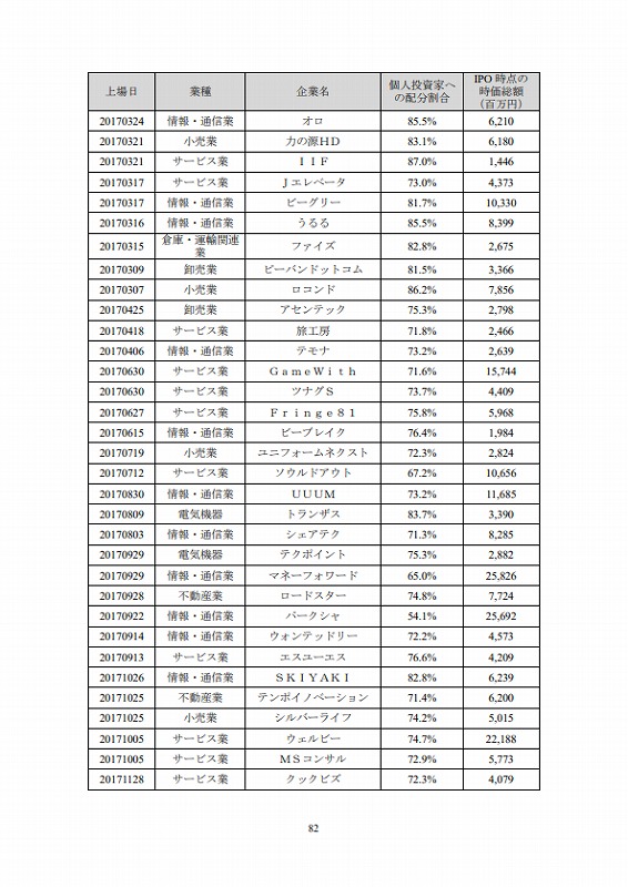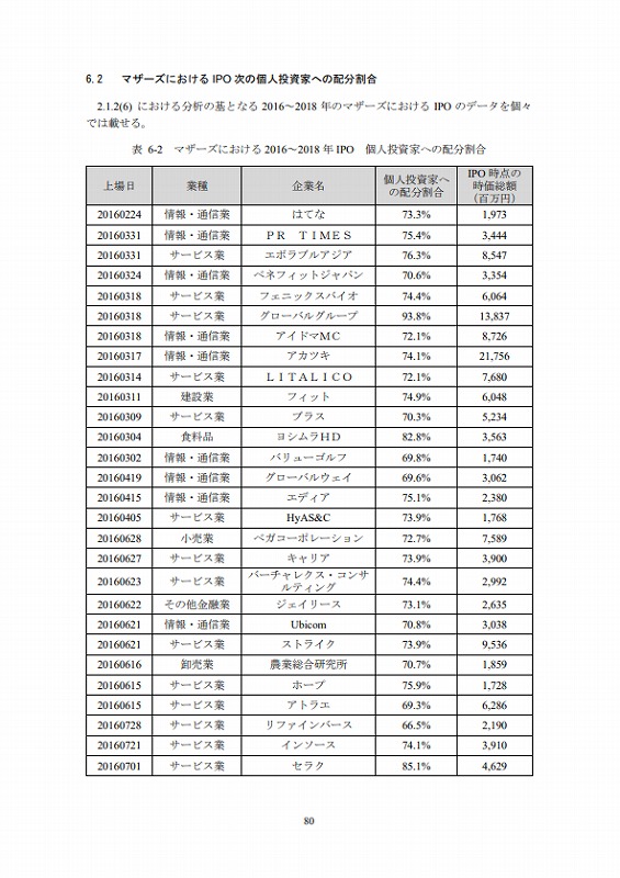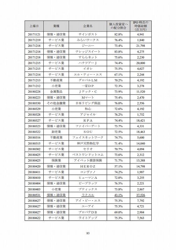 上場日/業種/企業名/個人投資家への配分割合/IPO時点の時価総額(百万円)